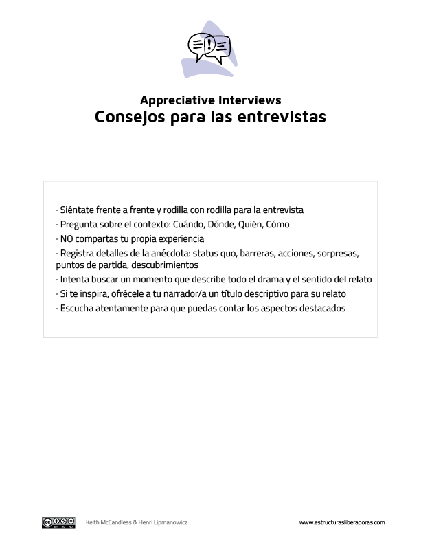 Appreciative Interviews es una estructura que ayuda a los participantes a enfocarse en experiencias positivas, explorando sus logros, éxitos y aprendizajes para impulsar nuevas ideas o mejoras.
